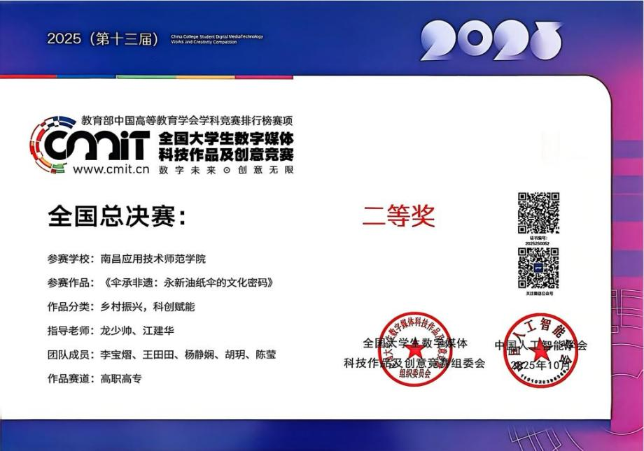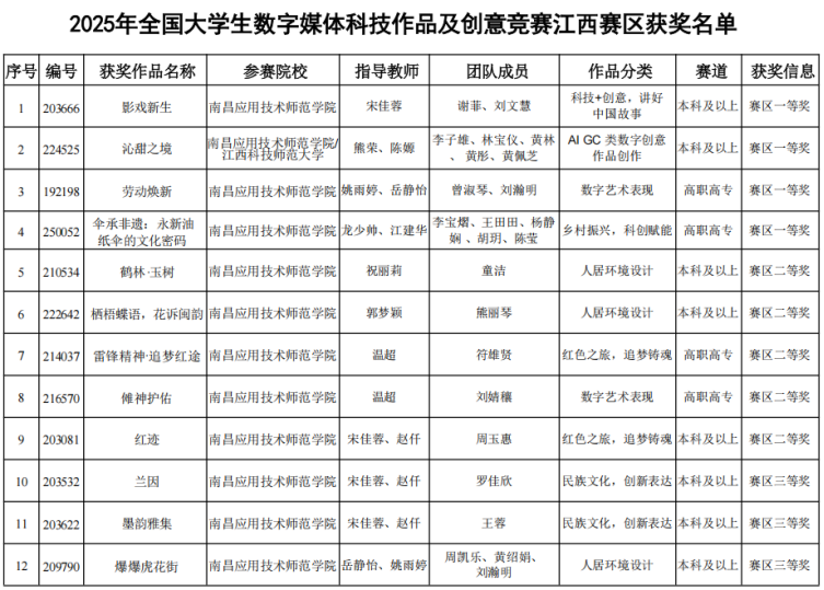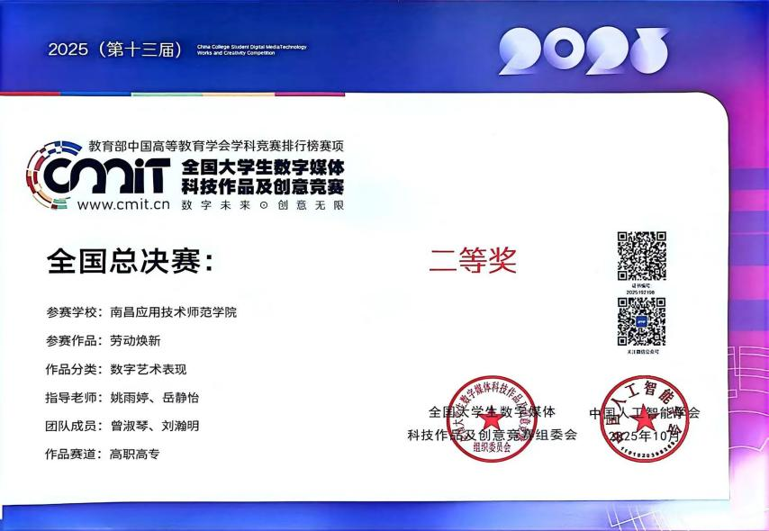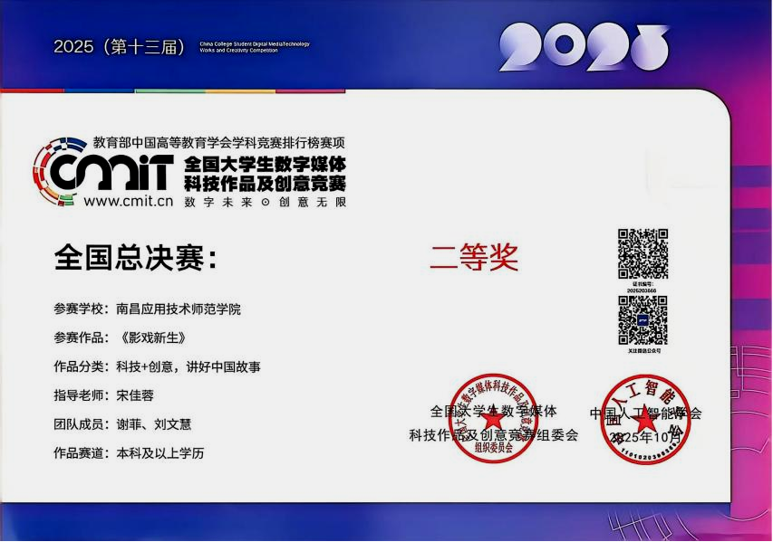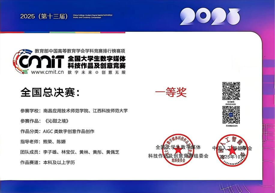 近日,南昌应用技术师范学院师生在全国大学生数字媒体科技作品及创意竞赛上,借深厚的专业素养、对作品细节的精准打磨及极具创新性的设计理念,展现了出色的综合实力,从全国海量参赛作品中脱颖而出,共斩获3项国家级奖项,其中一等奖1项、二等奖3项。18项省级奖项。其中,一等奖4项、二等奖5项,三等奖9项。
