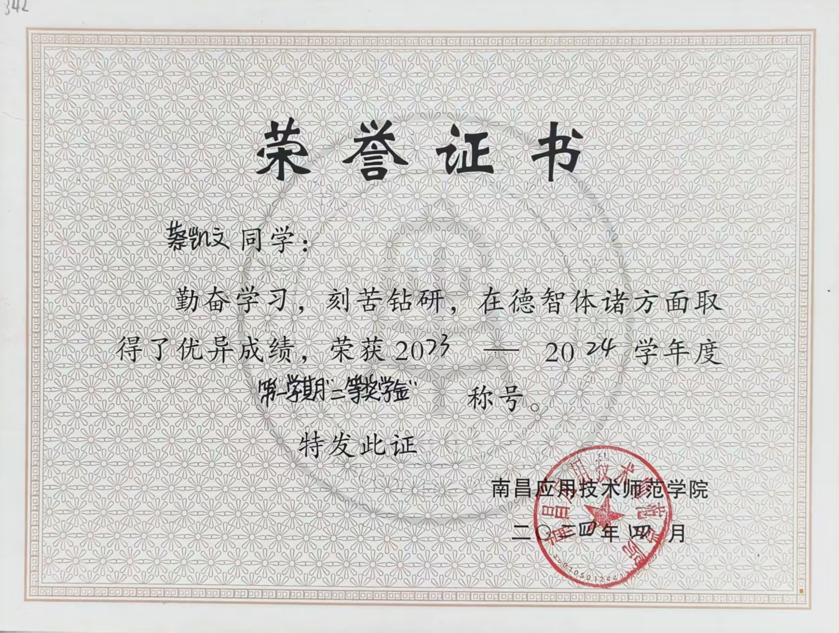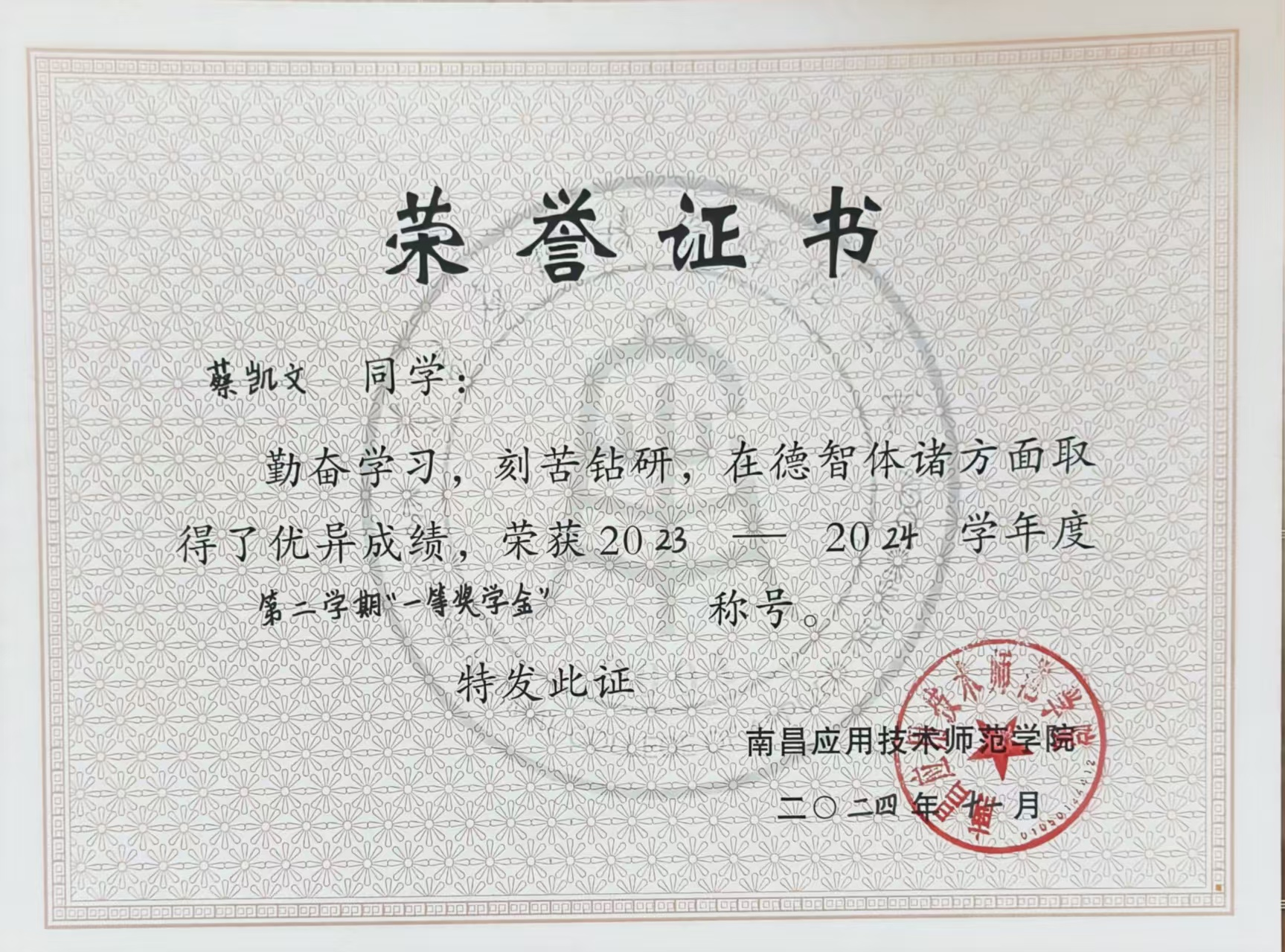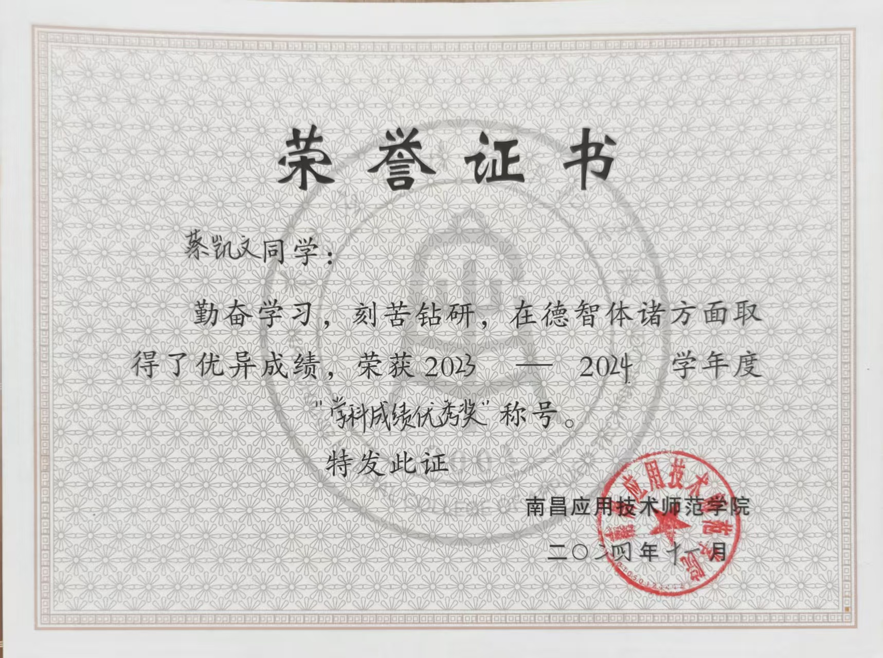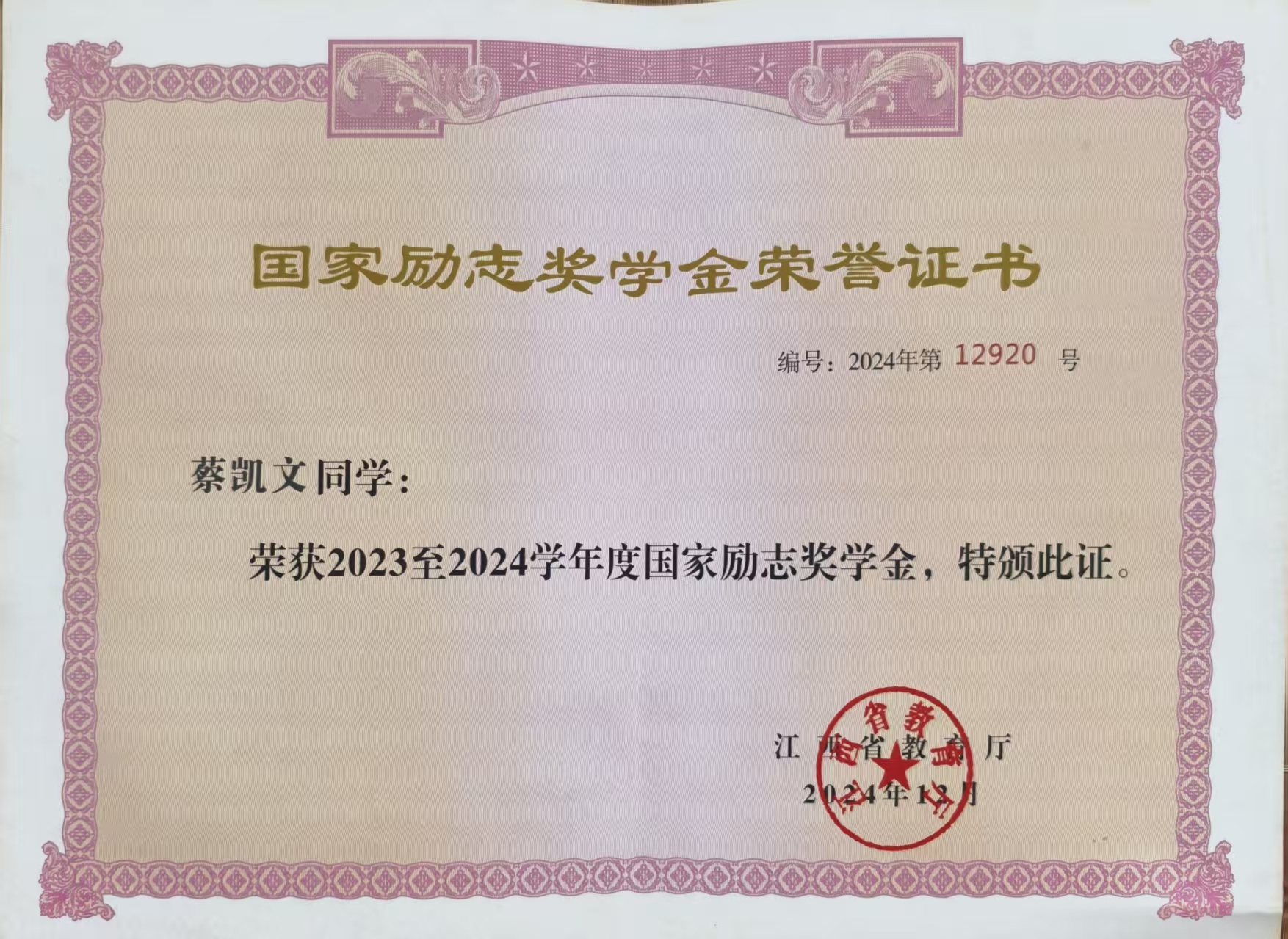 核心荣誉:国家奖学金,国家励志奖学金,二次校级一等奖学金,一次二等奖学金,校三好学生,优秀学生干部,学科成绩优秀奖