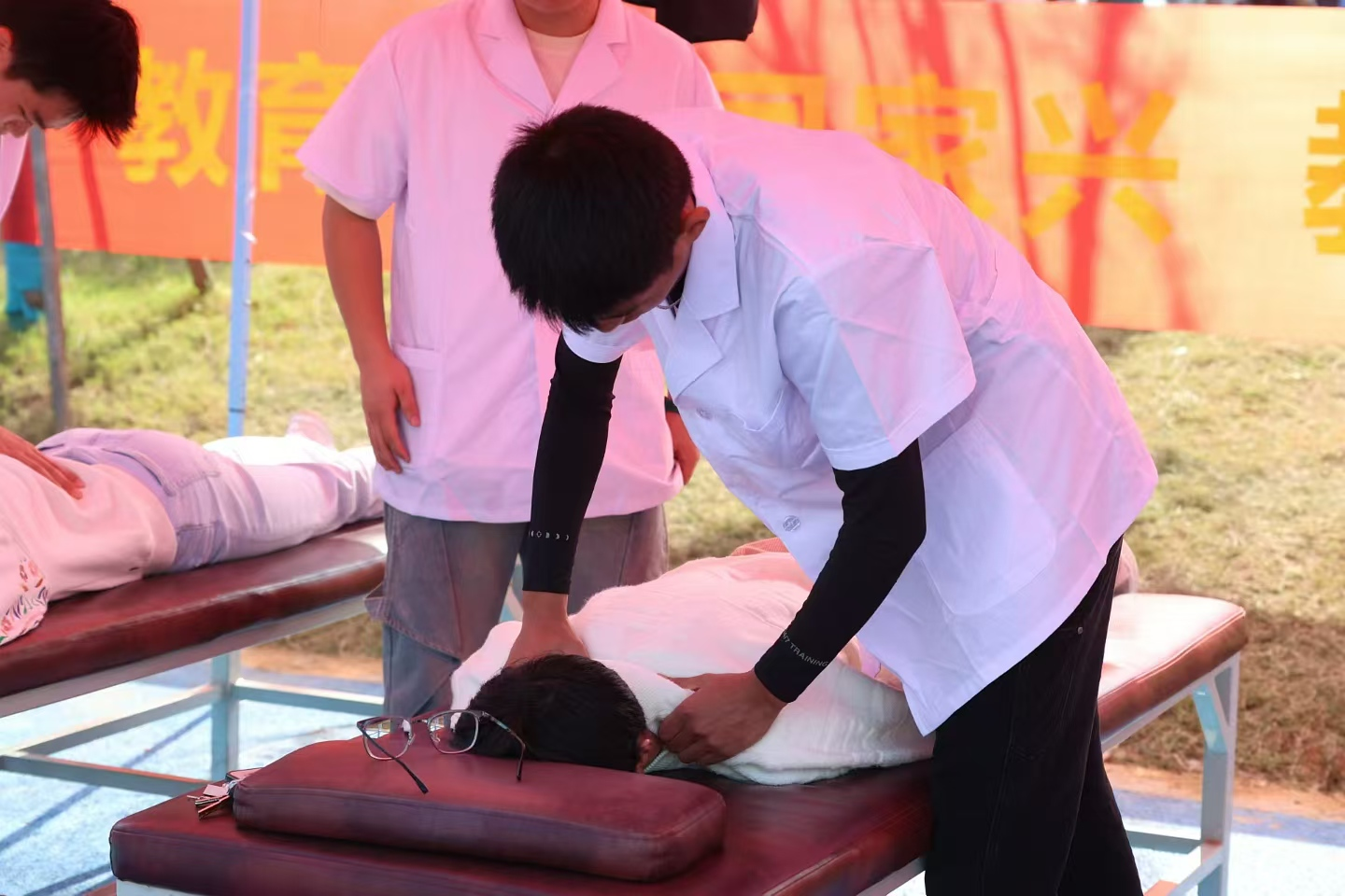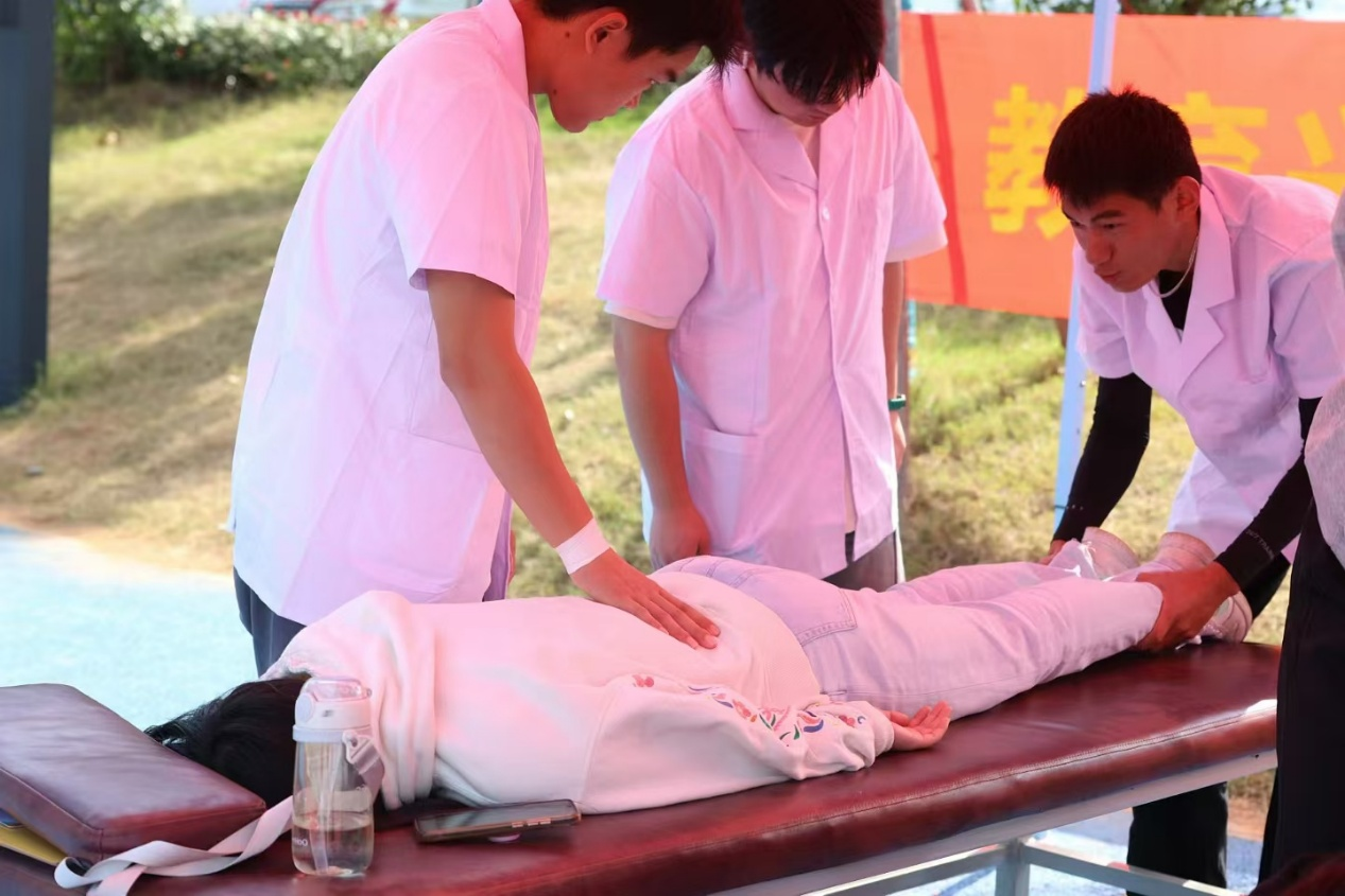 依托专业技能,我主动承担校园体育活动的医疗保障工作,筑牢运动安全防线: 作为校运动会的现场保健人员,提前备好急救包等物资,全程值守赛场,及时处理扭伤、肌肉拉伤、抽筋等突发状况,避免损伤加重。利用寒暑假我主动对接校外康复机构与校医院康复科,参与临床实践,将理论知识转化为实操能力: