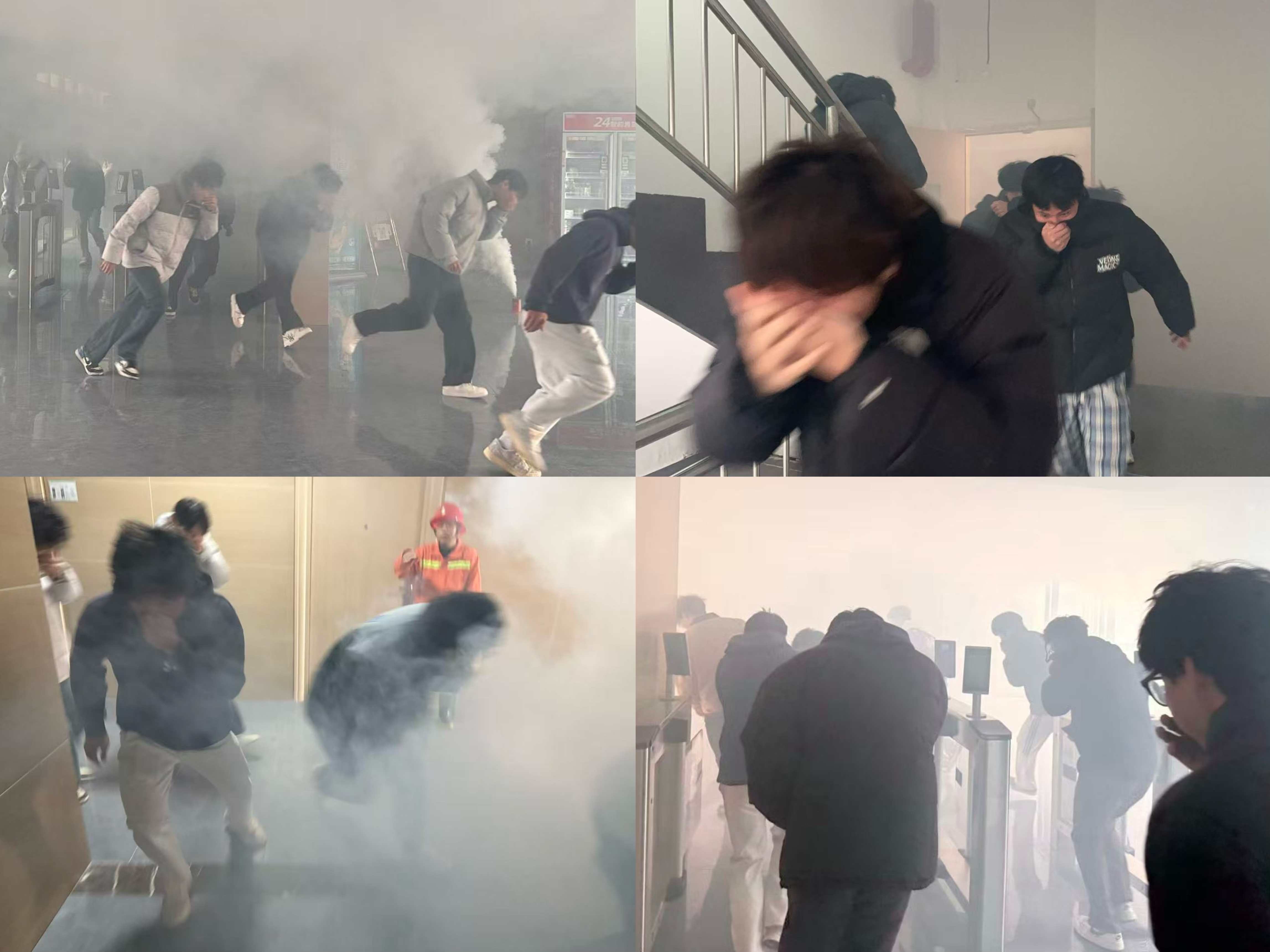 随着警报声响起,演练正式开始。在老师的有序指挥下,全体学生用湿毛巾捂住口鼻,弯腰低姿,沿预定路线快速、有序地撤离至操场安全区域。整个过程紧张而高效,无拥挤、无滞留,达到快速响应与安全疏散的预期目标。