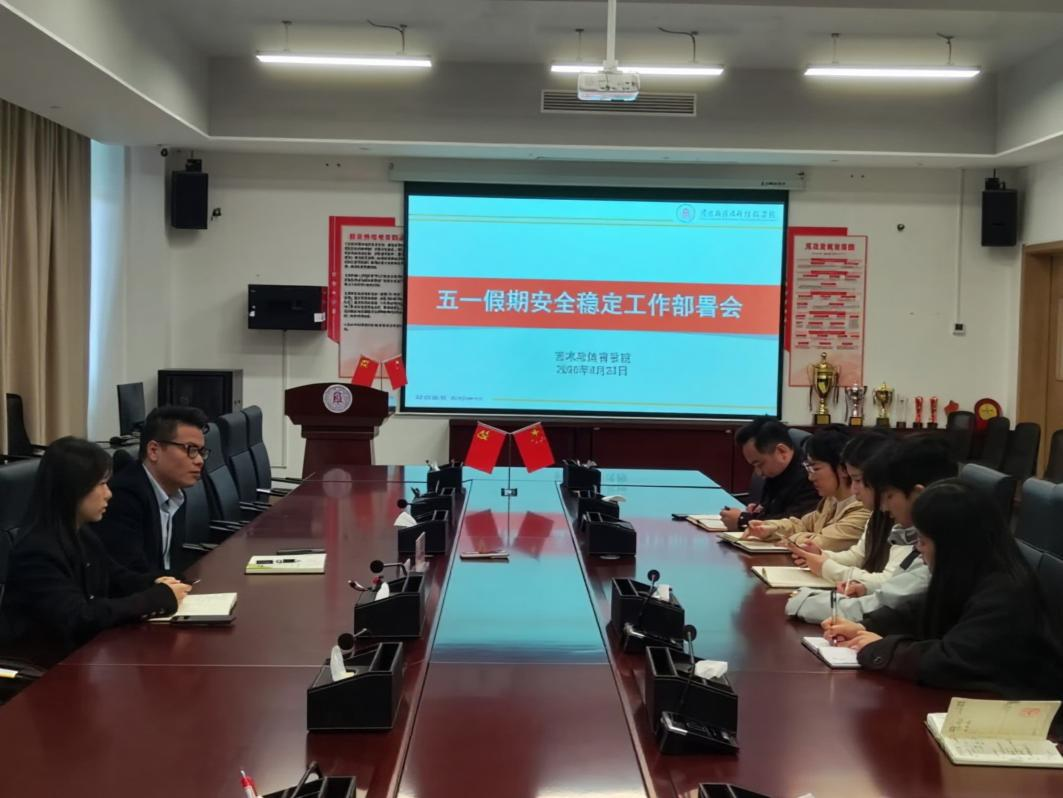 为做好“五一”假期校园安全稳定工作,防范各类安全风险,保障学生安全与校园正常秩序,近日,我院召开五一假期安全稳定工作部署会,学院党总支书记王洪波、副院长朱华,以及各科室负责人与全体辅导员参会,会议由王洪波主持。